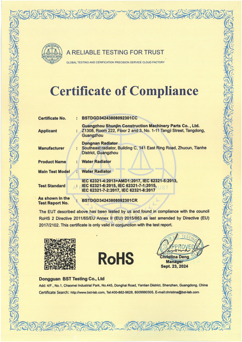 We have applied for RoHS (Restriction of Hazardous Substances) certification. This demonstrates our proactive commitment to environmental responsibility by restricting the use of specific hazardous materials (like lead, mercury, cadmium) in our excavator radiator manufacturing processes. Our goal is to provide environmentally safer products.